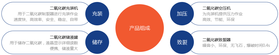 二氧化碳在低于31攝氏度或壓力大于7.35MPa時以液態存在,而超過31攝氏度時開始氣化,且隨溫度的變化壓力也不斷變化。利用這一特點,在致裂器主管內充裝液態二氧化碳,使用致裂器快速激發加熱裝置,液態二氧化碳瞬間氣化膨脹并產生高壓,體積膨脹600-800倍以上,當壓力達到極限強度時,高壓氣體沖破釋放并作用在巖體、礦體上,從而達到膨脹致裂的目的;克服了以往用炸藥爆破開采、預裂中破壞性大及危險性高等缺點,為礦山及巖石的安全開采和預裂提供可靠保證,可廣泛應用于礦山、水泥、采石等諸多行業。同時,二氧化碳致裂器致裂過程中快速釋放的二氧化碳氣體具有降溫作用,二氧化碳又是惰性氣體,完全可以避免因放炮產生明火導致的相關事故。